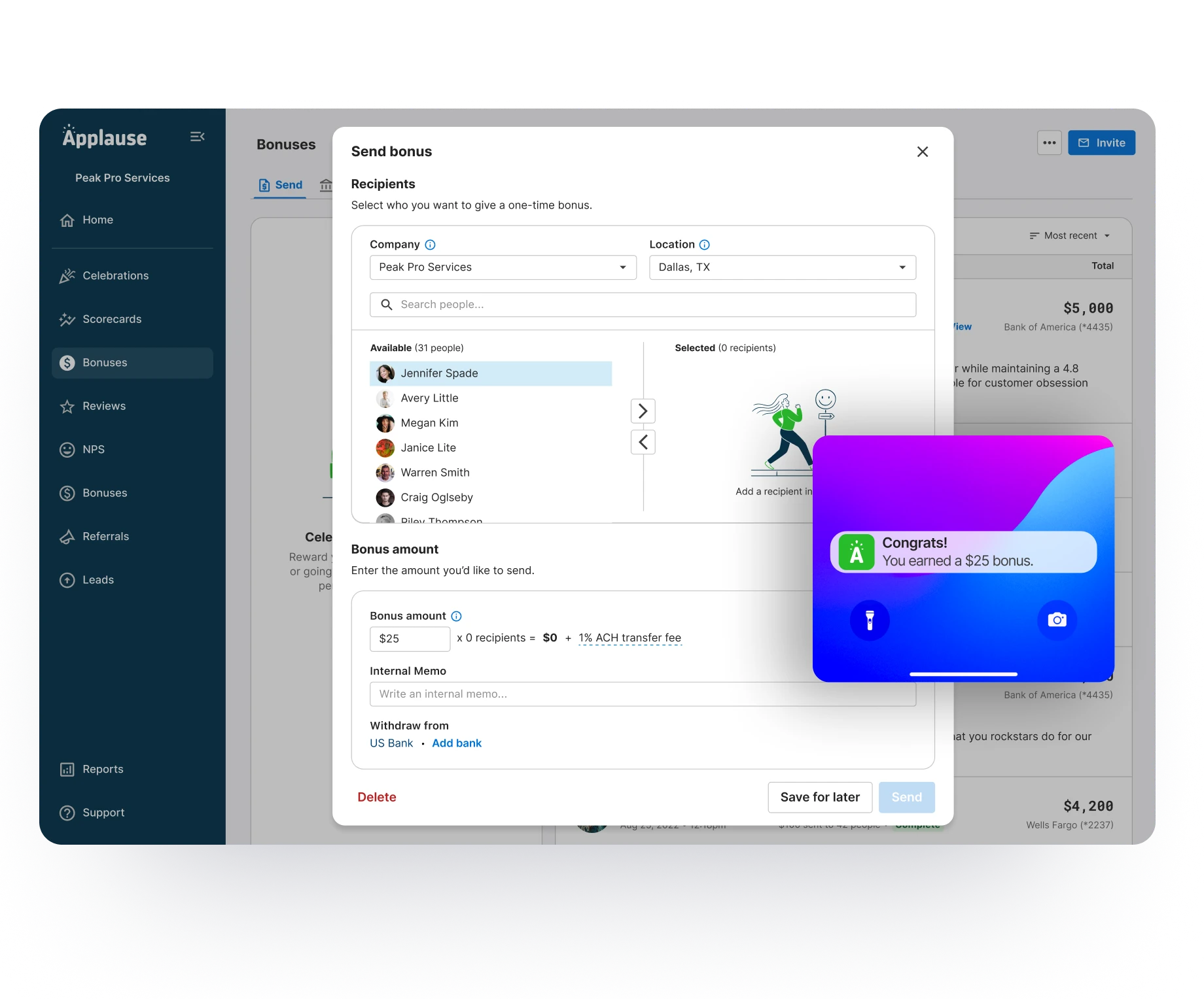 Learn more ➔Build team incentives that are tied to company goals. Use bonuses to improve attendance, increase upsells, celebrate work anniversaries, or any other performance-based initiative.