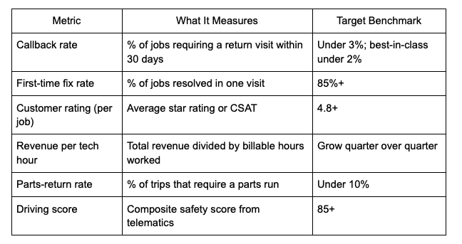 Callback rate, first-time fix rate, customer rating per job, revenue per technician hour, parts-return rate, and driving score. Individual visibility at the technician level is what turns these KPIs into behavior change.